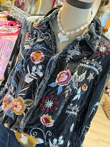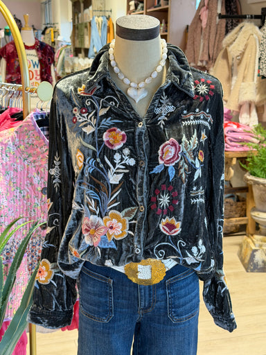 The Ova Velvet Shirt is an exquisite addition to any wardrobe. Made from a luxurious rayon silk blend, its elegant gray velvet fabric is beautifull...