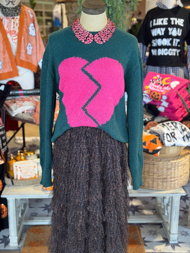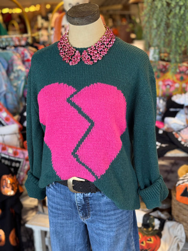 Hunter green sweater with broken heart design. True to size 100% polyester Circumference;S- 40 inchesM-44 inchesL- 46 inches