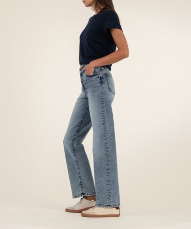 Capture timeless style with these high rise straight leg jeans featuring a roomy fit and classic medium wash. With 5 pockets and made from stretch...