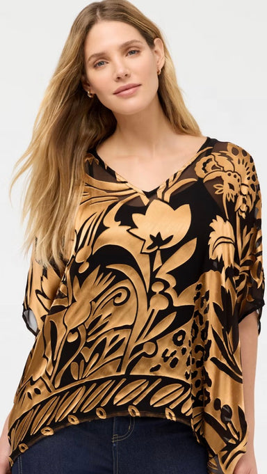 Crafted from a rich silk blend, the Claudia Renee features an ornate scrolling pattern in vibrant color. Designed with elbow length sleeves and a c...