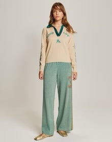 Cashmere, cotton, metallic, wool .Elastic waist and wide leg. Pair with our matching Millie polo knit for a complete, stylish look