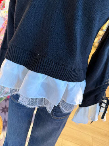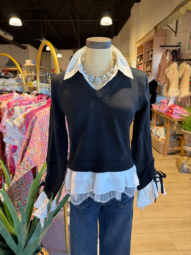 Partial satin blouse layer inside a relaxed fit sweater. Model in BLACK/PEARL is 5'8" They are wearing size Small. Collared Lace trim Basic fit R...