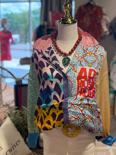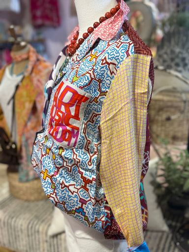 Button down, long sleeve, collared shirt with cuffs and front pocket. Sleeves have two different patterns. Cuffs are contrasting. Shipobo features ...