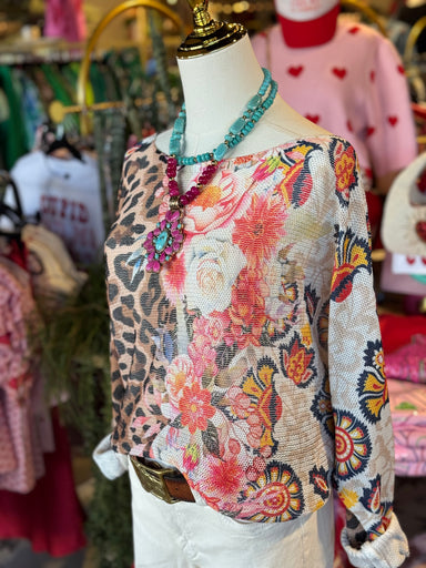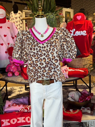 The Renée Leopard Sweater features short puff sleeves and a vibrant pink and red color scheme, making it suitable for various occasions. Crafted fr...
