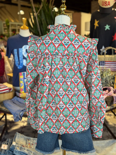 Geometrical vibrant blouse with collar detail. Viscose/ Cupro fabric. Runs true