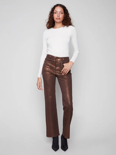 Patch Pocket Flare Metallic Twill Pants feature a standout bronze metallic finish with eye-catching rivet details, making them perfect for any even...