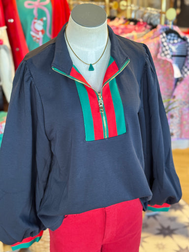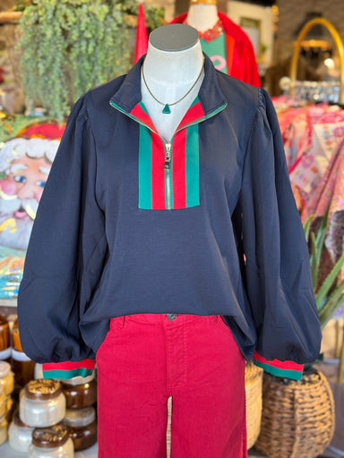 The Lindsey Top in navy is a sophisticated addition to your wardrobe. Made from a comfortable cotton spandex blend, this top features a bold red an...