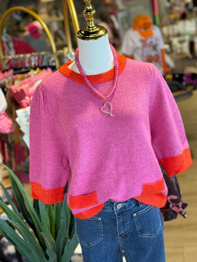 On Sale Vogue Sweater Top $79.00 | / Experience stylish warmth with our Vogue Sweater Top. Crafted with a trendy colorblock design in pink and orange, this top is perfect for adding a ... View full details