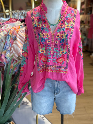 Crafted from a lightweight flowing fabric, the Simone Blouse is adorned with vibrant color and intricate embroidered detailing. Designed with a...