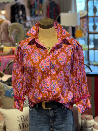 Pink floral cotton blouse with pink ric Rac design. Custom print. Runs true