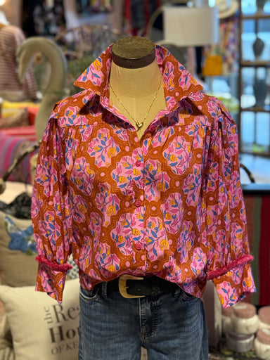 Gorgeous pink floral with slight puff sleeve and fringe detailing at cuff. Button up detailing. Runs true to size. Cotton CIRCUMFERENCE: XS- 42 in...