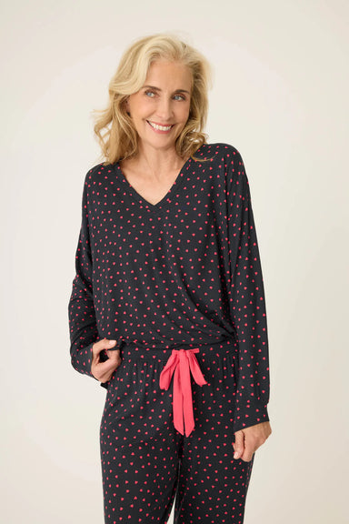 You will love this black long sleeve PJ top! Its playful design offers a chic look for those relaxed evenings at home. Perfect for lounging or curl...