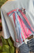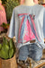 Oversized light blue tee with pink cowboy boot and fun streamers.
