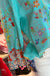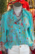 The Hannah Top features a striking aqua color complemented by embroidered ruffles at the sleeves, enhancing both aesthetic appeal and comfort. The butterfly pattern on the back offers a unique design element, while the scalloped bottom—crafted from a rayon blend—ensures a soft, lightweight feel, promoting ease of movement.