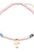 Pastel pink clay heisi necklace with larimar stones and small gold cross, 16" with 2" extender