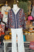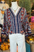 The mandolin top in vintage daisy blends, laid-back ease with bohemian flair, making it a stand out for fall. It’s Doman sleeve. Silhouette creates a relaxed, drape fit, while the neckline and contrasting center trim lend a flattering, eye catching finish.