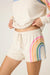 - Vibrant rainbow patterns on top and shorts.