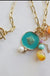 Hanging from it are pieces that evoke the marine universe-such as corals, shells, and stars-combined with natural stones that add shine, color, and texture, along with small details in soft tones and pearls that add a delicate and luminous touch.