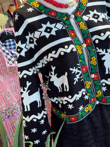Nordic black and white print embellished cardigan with pearl details. 55% Acrylic45% cotton Circumference:S- 41 inchesM- 43 incgesL- 45 inches