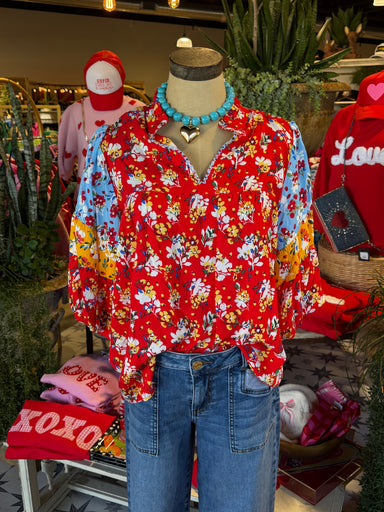 This Haley Red Floral Top is a best-selling style featuring a bold red and white floral print and ruching details. Made of soft cotton, it offers b...