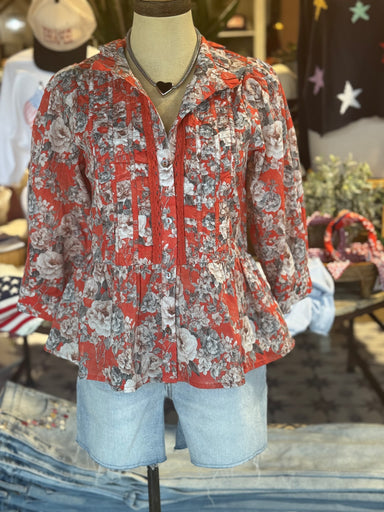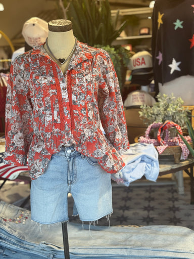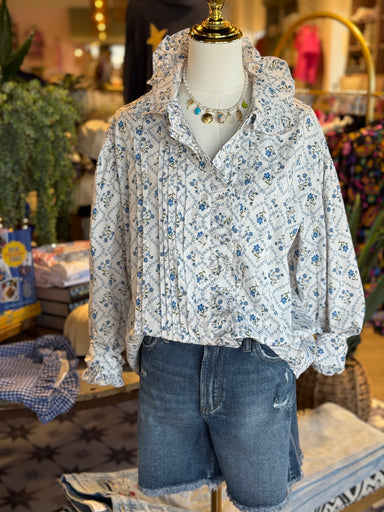 Elevate your wardrobe with the Blakely Top. Adorned with a delicate French blue floral pattern, this top features a pleated ruffle collar for a tou...