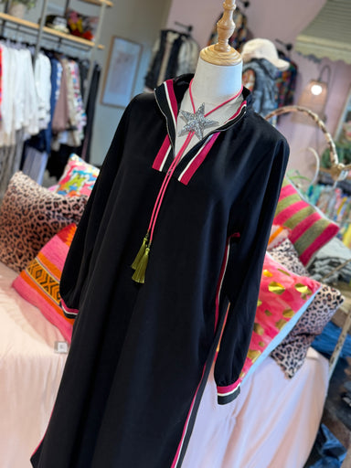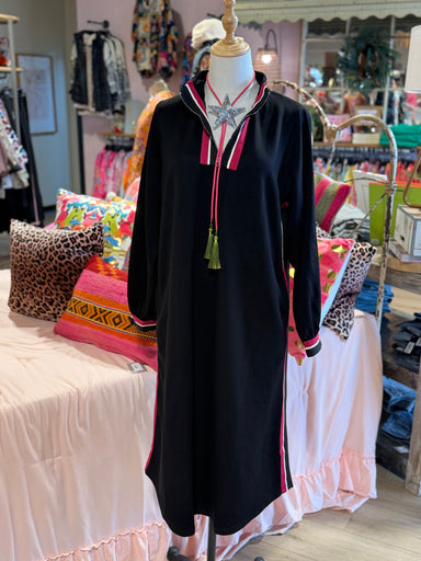Experience comfort and style with the Easy Breezy Dress. This sleek black dress is accented with pink and white stripes on the sides and collar, gi...