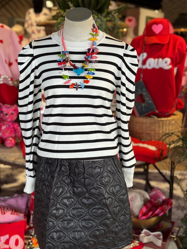 The Tracey Ann Sweater features a sophisticated black and white striped design, crafted from a viscose blend that ensures comfort and breathability...