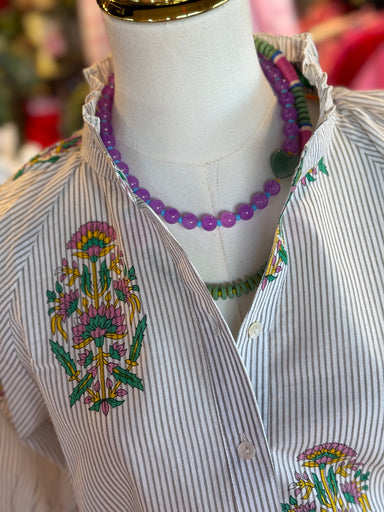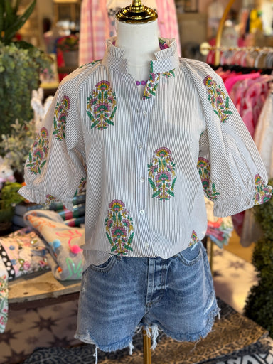 On Sale Courtney Lynn Top $89.00 | / Floral stripe top with hand made stamped fabric. Button detailing.