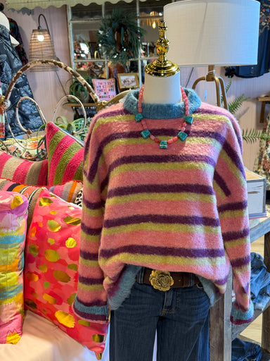 $49.00| /The Clara Sweater is available in two distinct styles: a green variant with blue stripes and a pink variant with red stripes. Constructed from a co...