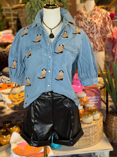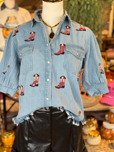 Boot, scoot, and boogey into the cutest game day fit. This denim short sleeve top is the perfect top for game day or a day out. The maroon embroide...