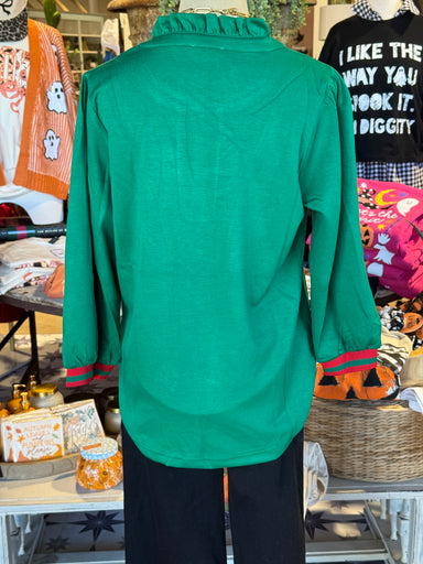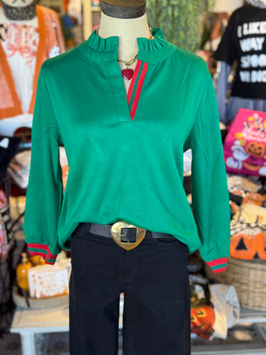Introducing the Nikki Top - a stylish green top made from a rayon blend with red and green stripes around the neck and sleeves. Expertly crafted fo...