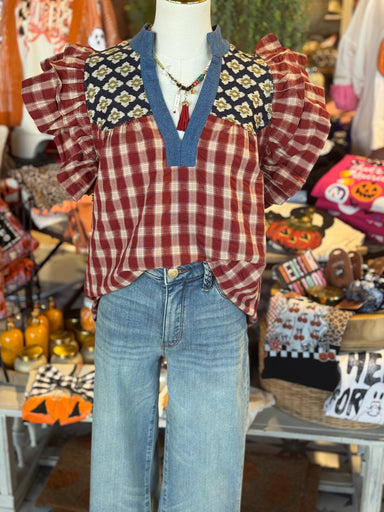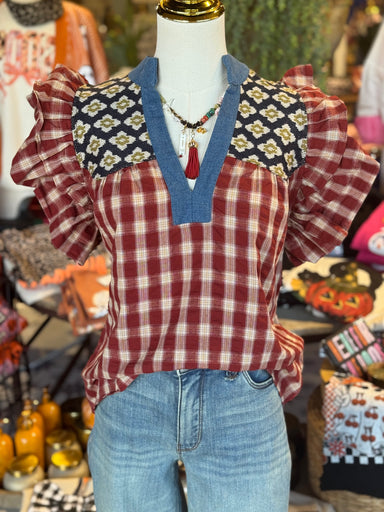 Introducing the Brittany Top - a stylish yet comfortable mixed media top featuring fluttered sleeves, a denim neckline, and a brick color checker p...