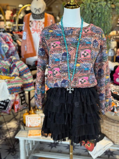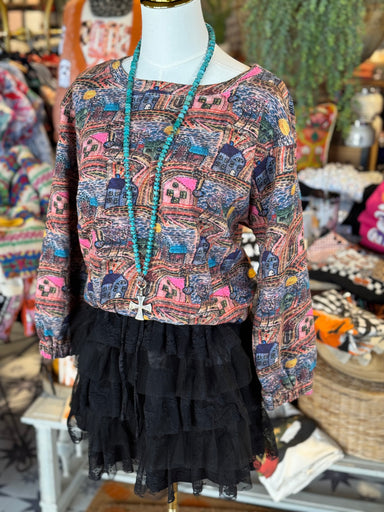 This top is sure to turn heads with its playful mix of colors and unique print featuring whimsical houses with windows. Stand out from the crowd wi...