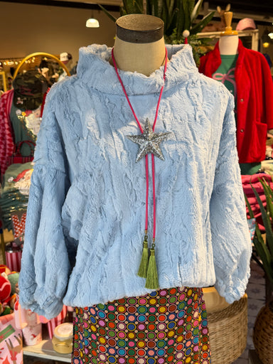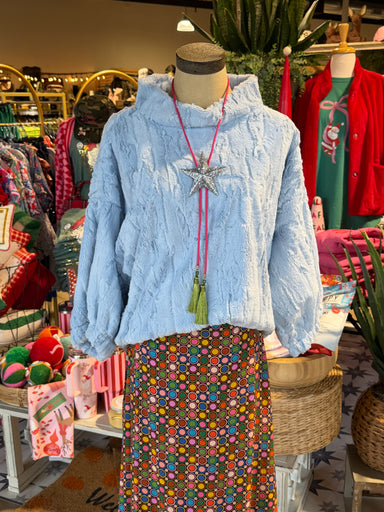 The Powder Popover is the versatile addition to your wardrobe you've been searching for. Its powder blue faux fur pop over design is perfect for dr...