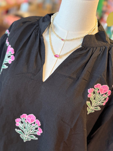 $59.00| /Black rayon blend top with floral embroidery. V neck with soft pleated. circumference: s 42in m 44in L46in