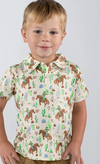 Introduce your little one to the classic western style with our Saddle Up Cowboy Polo Shirt. Made for toddlers, this shirt combines comfort and fas...