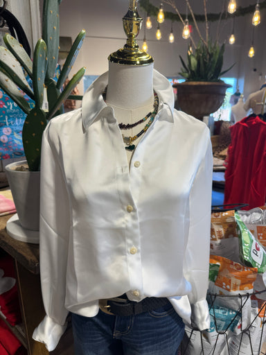 The Beverly Top is a luxurious, white satin top that is perfect for any occasion. With its wrinkle-resistant material, there is no need for ironing...