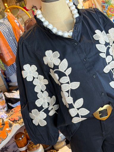 The Bethany Top features elegant off-white embroidery on a classic black button-up design. Made with high-quality cotton, this top boasts both comf...