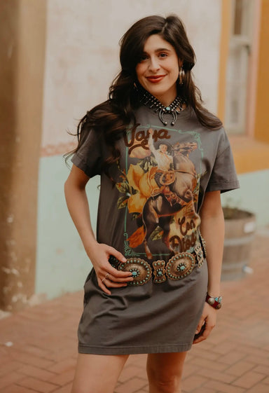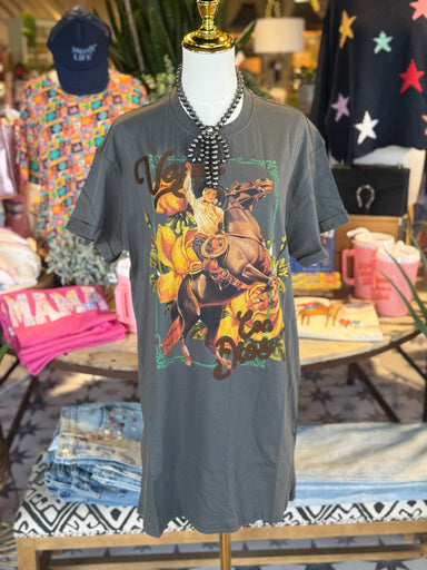 Easy, breezy, and full of spirit-the Vaya Con Dios Dress is your new go-to tee dress. Featuring a bold graphic of a cowgirl in motion, it's got all...