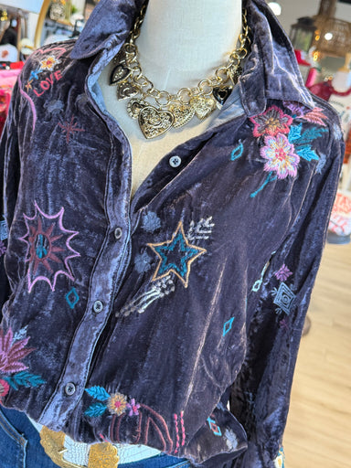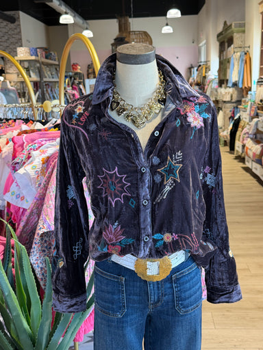 The Wrenley Shirt brings celestial charm and boho luxury together in one stunning velvet design. Crafted in soft, rich black velvet, this button-do...