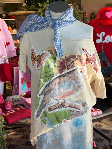 Floral print, graphic T with appliqué bird and butterflies. Cotton CIRCUMFERENCE:S/M : 44inL/XL : 48in