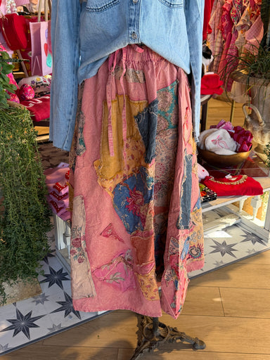patchwork skirt with tie waist. Does run roomy LENGTH: S/M - 33in L/XL - 34in