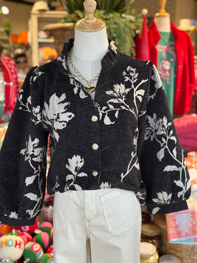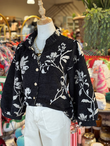 Black tapestry top with metallic flowers with gold buttons, introducing the Caterina Top, a luxurious addition to your wardrobe. Made with 100% pol...