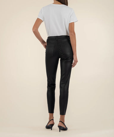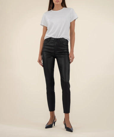 Coated stretch-denim fabrication Cigarette leg silhouette High rise waistline 2 functional front pockets 2 functional patch back pockets Raw hem...
