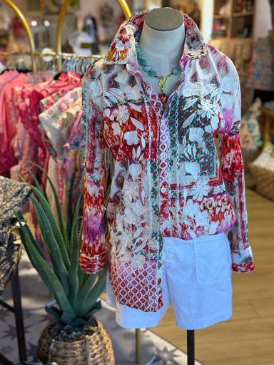 Flowy, long sleeve button down top in our Snake Charmer print with collar and skinny cuffs. Print on the body of shirt is blue stripes with a tree ...