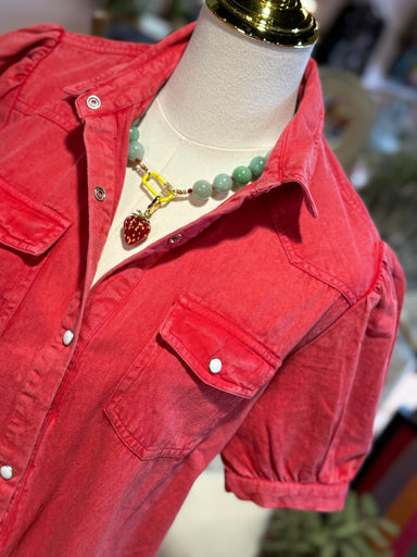 Introducing the Annie Dress, a versatile addition to your wardrobe. Made of durable red denim with pearl snaps and pockets, this dress is perfect f...