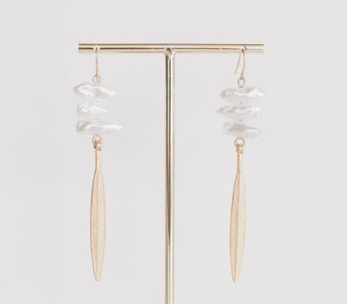 Experience the Birdie! A pearl stack and gold feather drop earrings, measuring 3". These dangle earrings artfully marry the beauty of semi-precious...