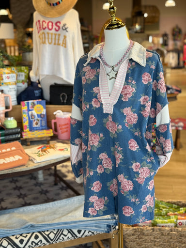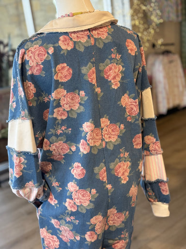 Great denim floral romper with side pockets. Stripe detailing. Cotton