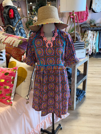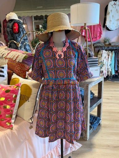 The Talia Tiles Dress features a tile print design crafted from cotton, ensuring breathability and comfort. Its ruffle and Ric rac detailing adds a...