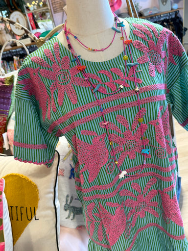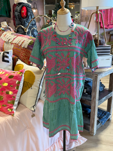 The Lora Lee Dress features a unique teal and pink stripe embroidery design, enhancing both visual appeal and fabric texture. Its ruffle detailing ...